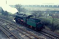 Nochmals Lok 4 der Grube Carl-Alexander am 28.03.1973: Die Lok setzt sich im Übergabebereich von ihrem Zug ab. Im Hintergrund sind im Güterbahnhof Merkstein abgestellte Kohlewagen zu erkennen. Foto: © Martin Welzel