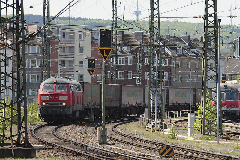 Wegen der Elektrifizierungsarbeiten an der L 24 wurde der TEC 40084 über die L 37 und die L 39 umgeleitet. Am 04.05.2008 zog 225 027 den Zug durch den Aachener Hauptbahnhof nach Rothe Erde. Dort wechselte der Zug die Fahrtrichtung und wurde von den belgischen 7783 und 7787 nach Belgien gezogen. Fotostelle |