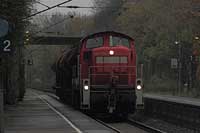 294 175 mit Güterzug der Akzo Oberbruch im Bahnhof Lindern am 08.11.2004. Die 1968 bei Deutz in Köln gebaute Lok entstand im Jahr 2000 nach dem Einbau einer Funkfernsteuerung aus 290 175. Fotostelle |